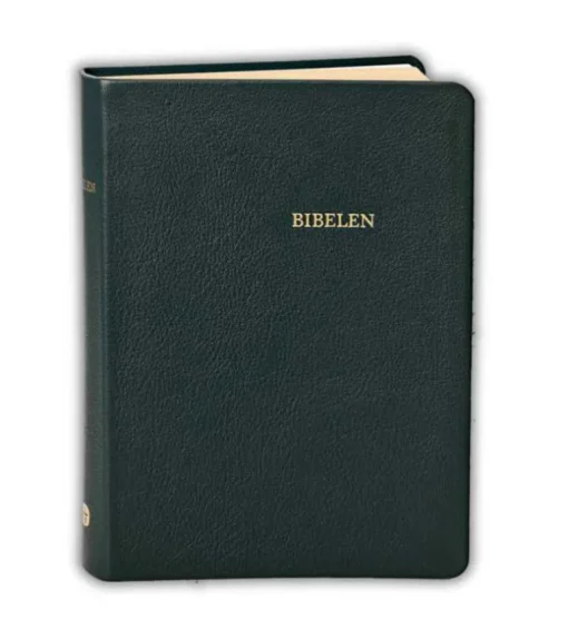 Luksusudgave af Bibelen i klassisk udseende med indbinding i sort ægte skind og med guldpræg på forside og ryg samt guldsnit på bogens kanter.