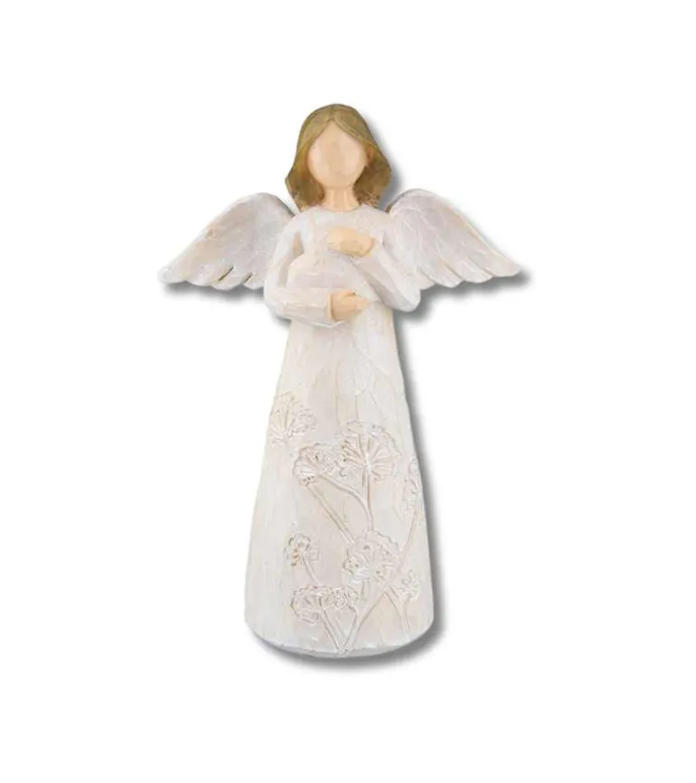Lille smuk figur af en engel med motiv af blomster på sin kjole, som holder et hjerte tæt.