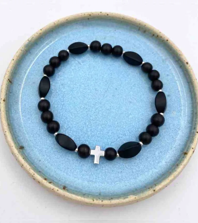 Flot kvalitets armbånd lavet ud af sølv-, glas- og træperler og med et fint kors i sterling sølv.