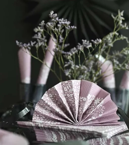 Servietterne er fyldt med små blomster og rundt i en cirkel står der FAITH – HOPE – LOVE (Tro – håb – kærlighed)