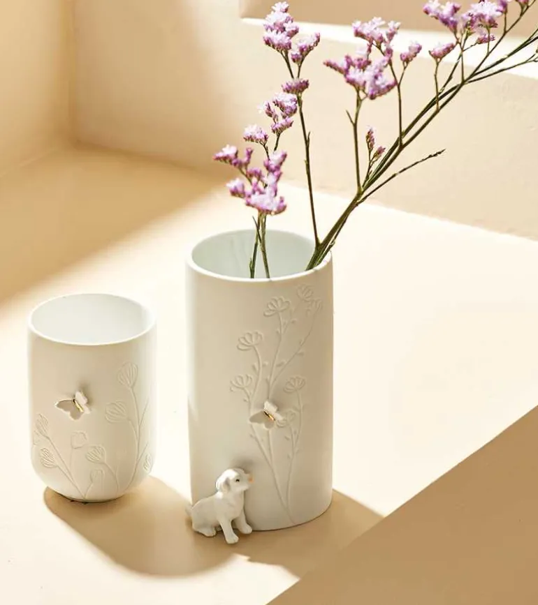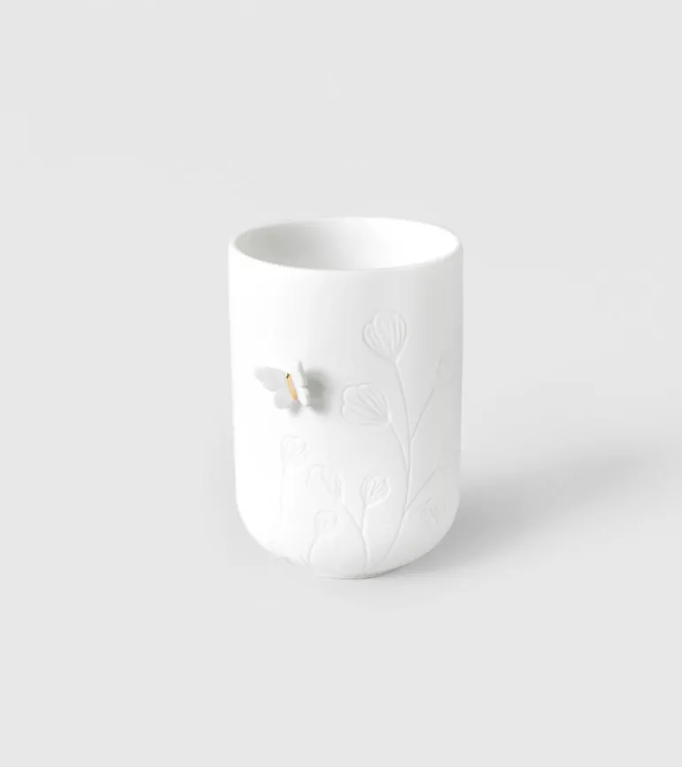 Elegant fyrfadsstage med sommerfugle og blomster.