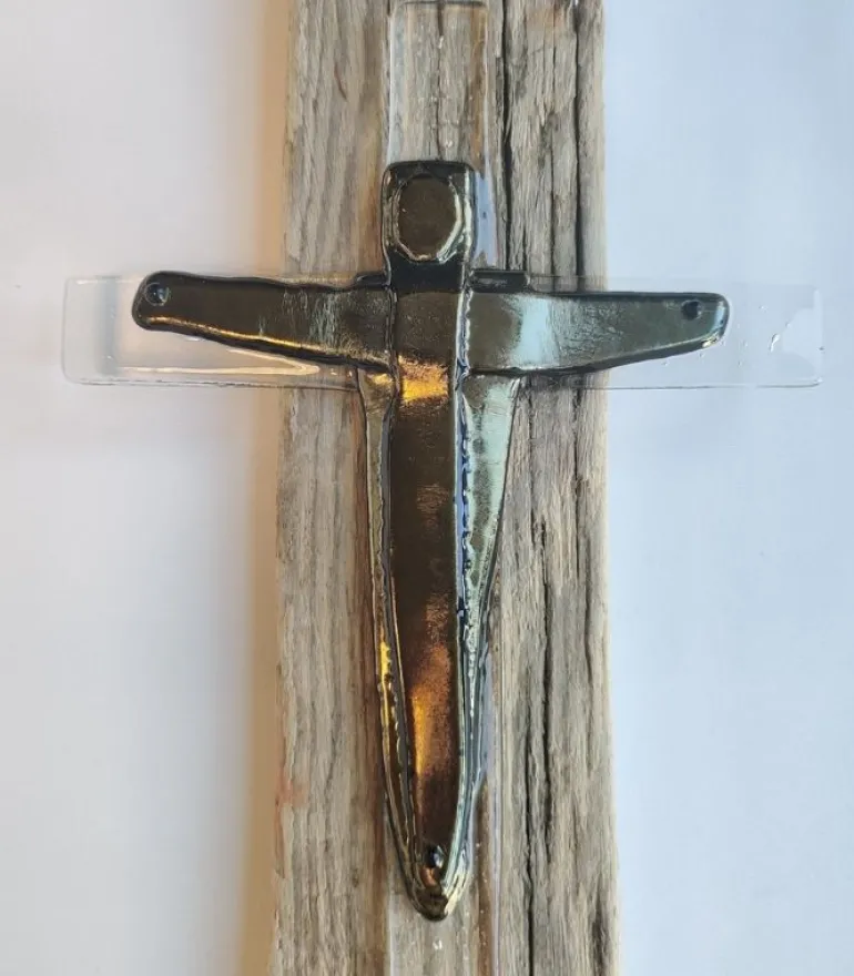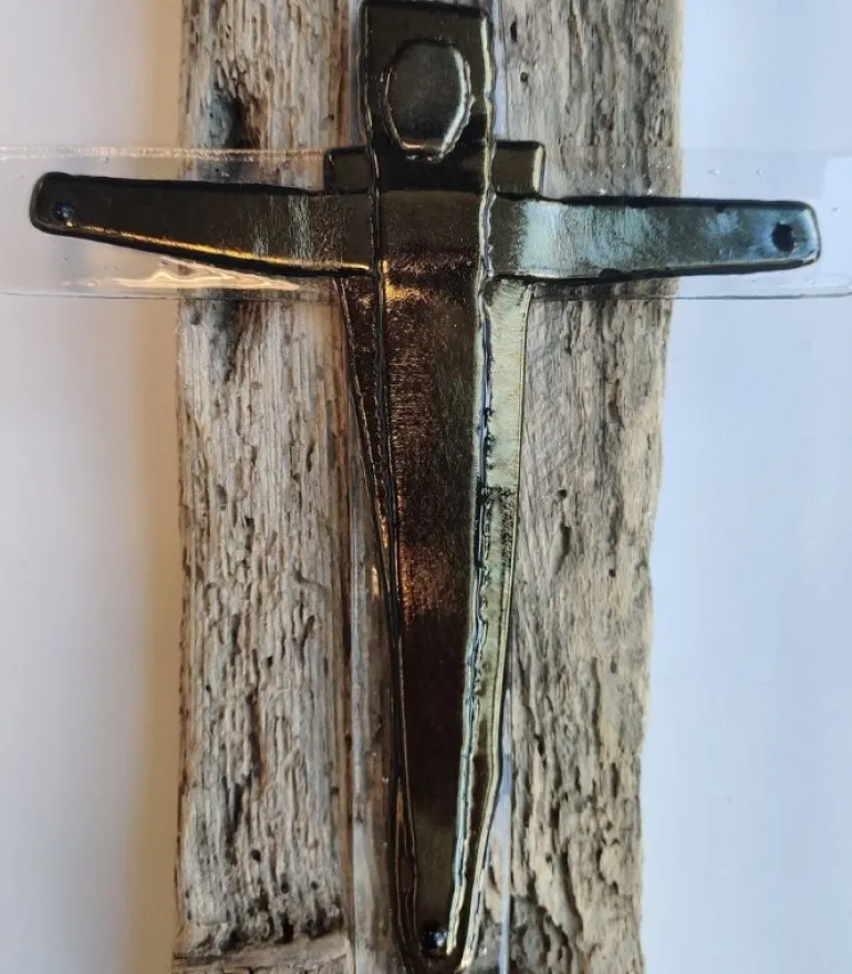 Smuk kors i mørkt glas, med en guld-ish overflade, der skinder en smule. Virkelig smuk