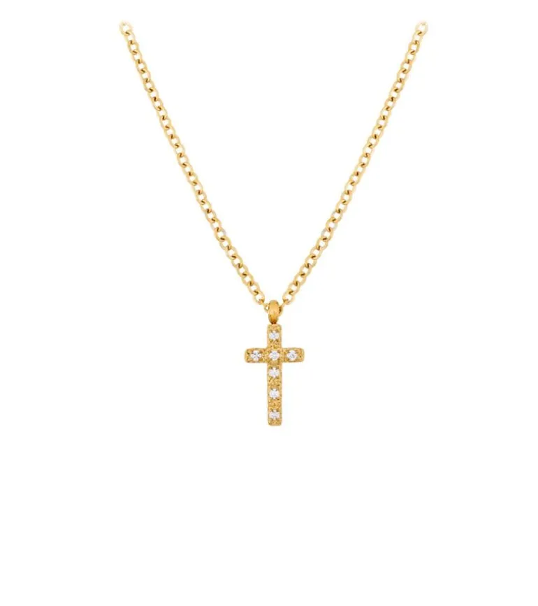 Halskæden er guldfarvet, og vedhængskors har små rhinsten.
