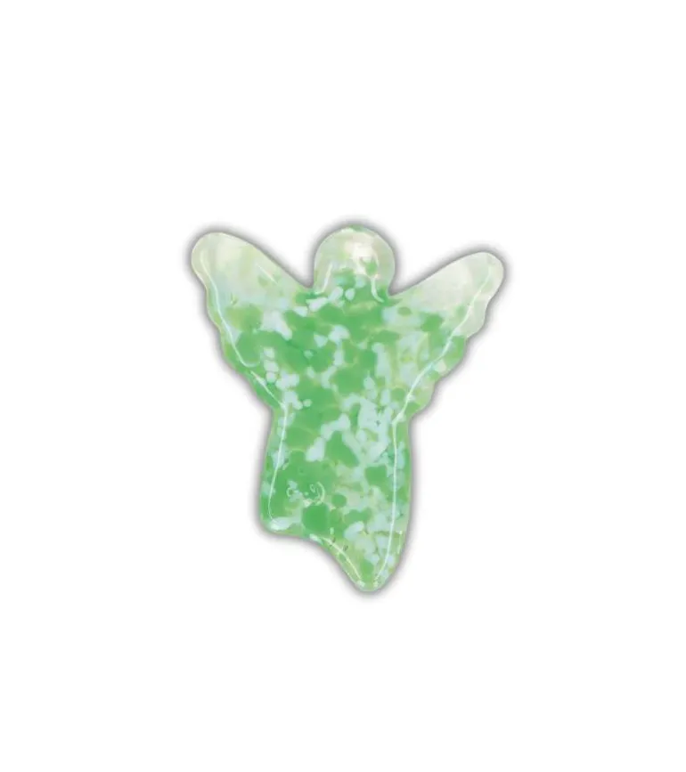 En lille glasengel til lommen, der er lavet i grønt smelteglas i form af en engel.