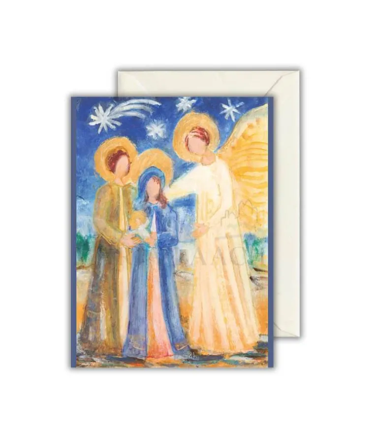 Smukt julekort med Englen Gabriel, der står ved Josef og Maria, der står med Jesusbarnet på armen.