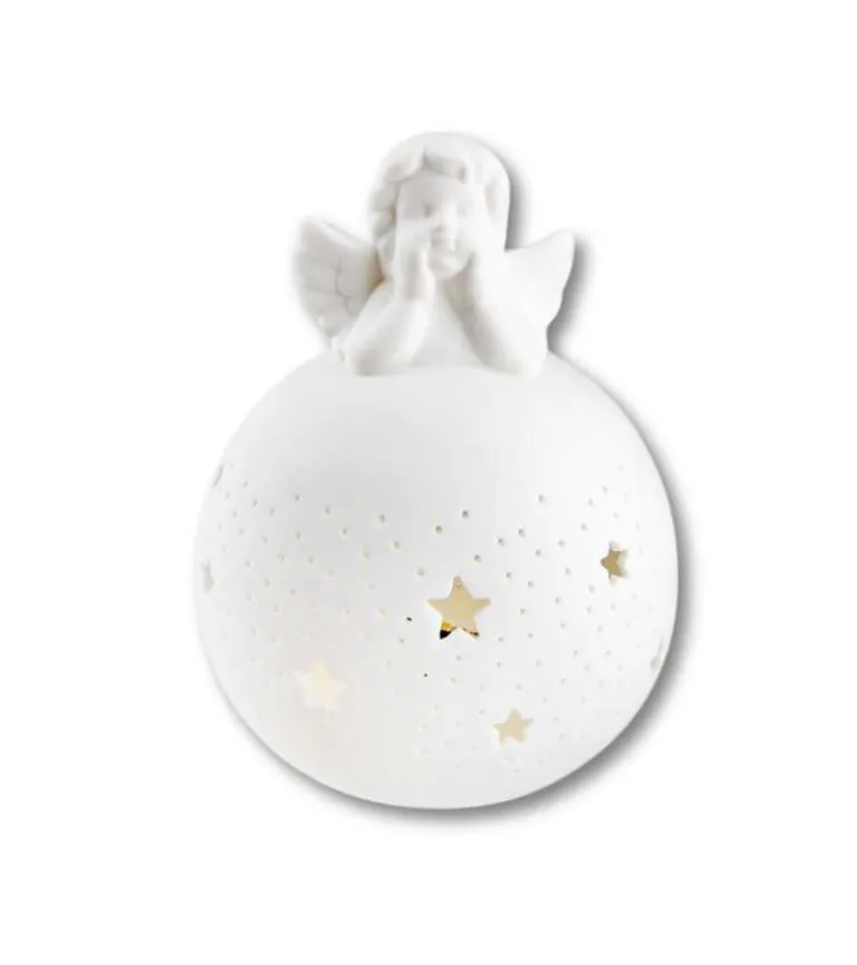 En sød engel sidder på toppen af en rund LED kugle. På kuglen er der fine stjerner.