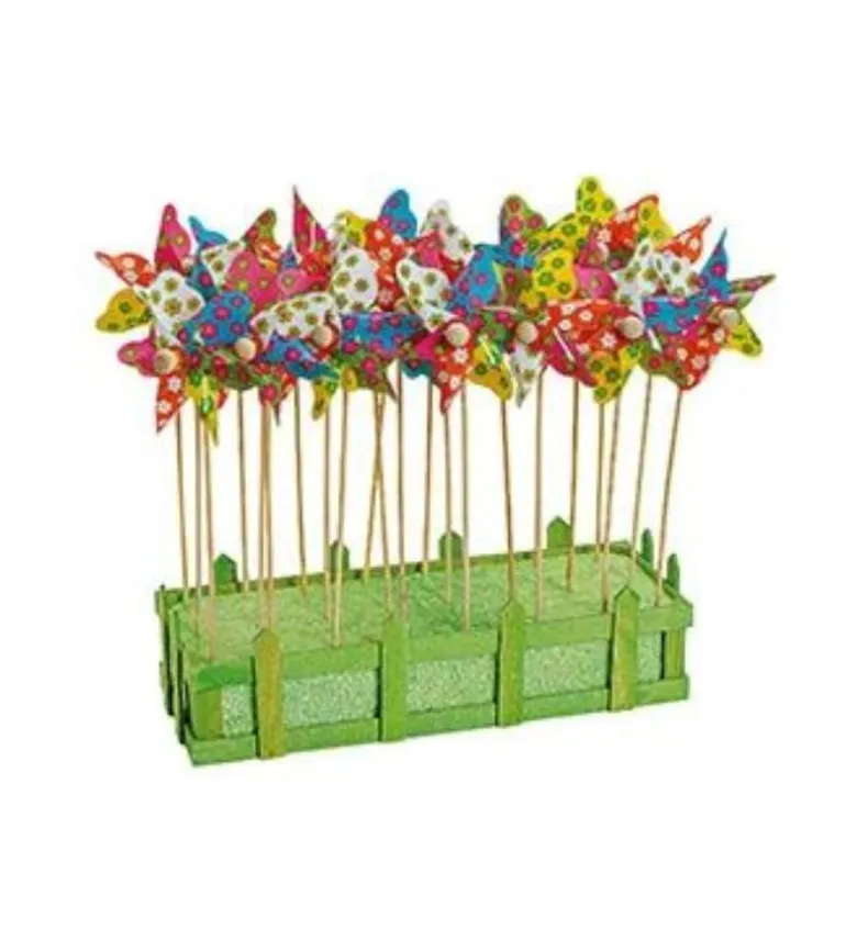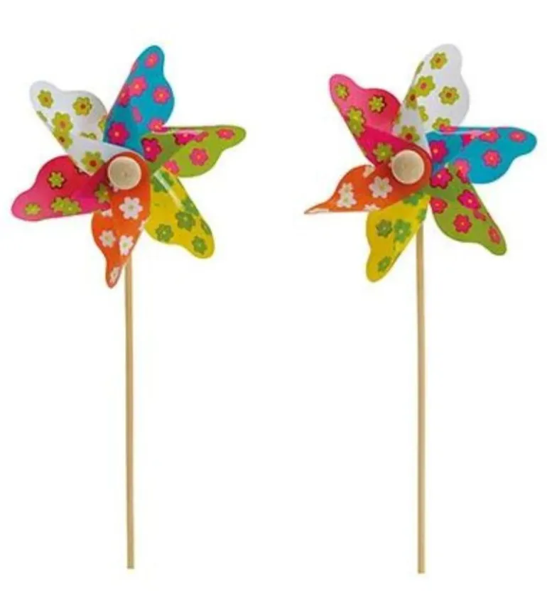 Vindmølle på træpind. Vingerne er af plastik. Hver vinge har forskellig farve, med blomstermotiver på.