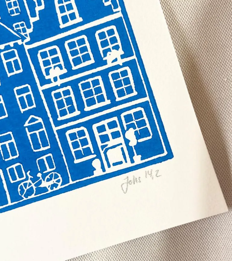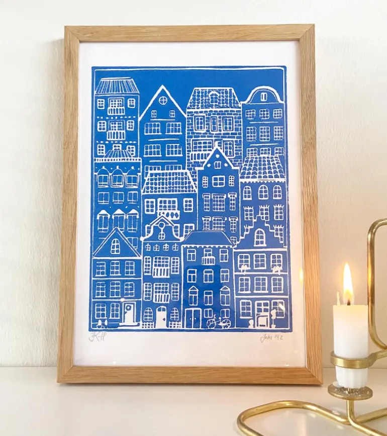 Linoleumstryk er en god kontrast til de meget grafiske plakater, man også kan finde herinde, og trykket arter sig særligt godt i en ramme med passepartout.