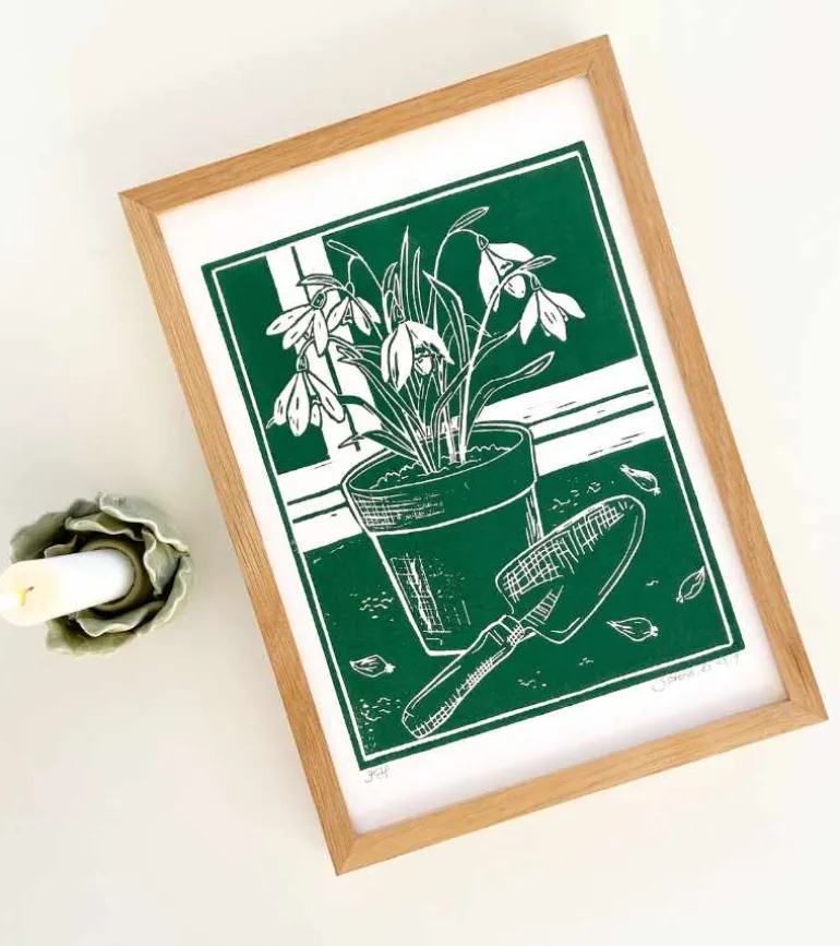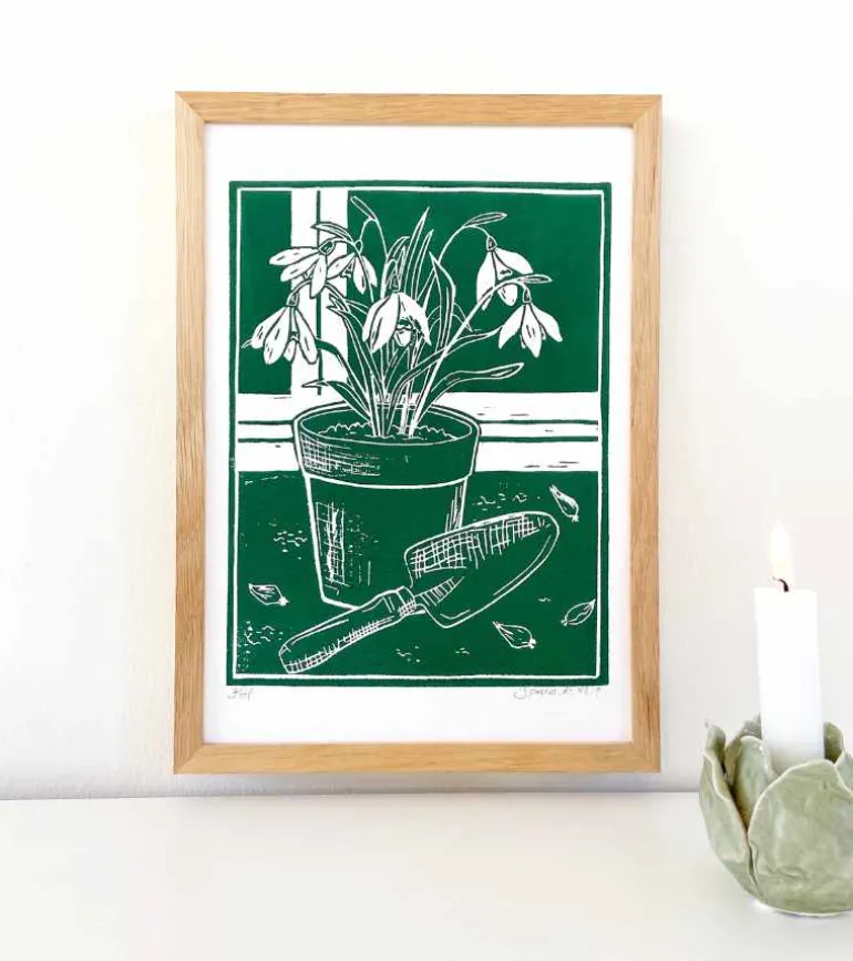 Linoleumstryk er en god kontrast til de meget grafiske plakater, man også kan finde herinde, og trykket arter sig særligt godt i en ramme med passepartout.