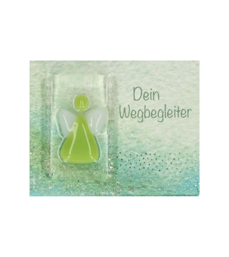 Denne engel i glas er lavet efter fusing-teknik, hvor man smelter flere slags glas sammen. Det giver det smukke udtryk i glasset med forskellige farver.