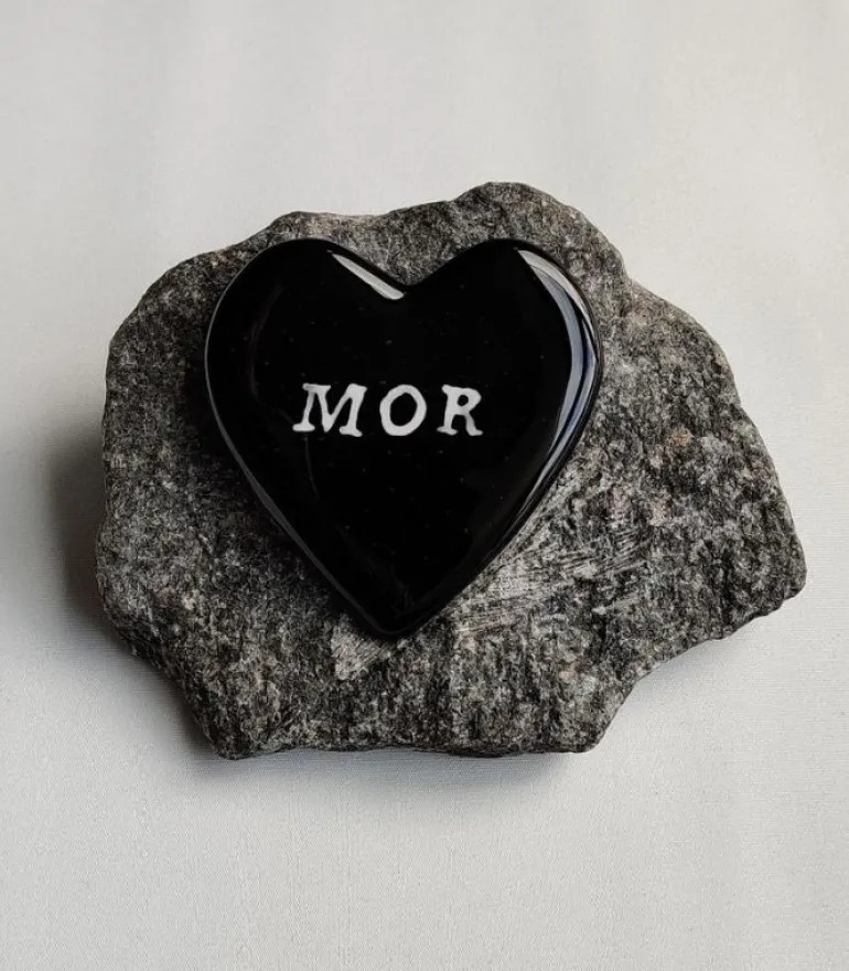 Flot sort glashjerte med teksten MOR, der er monteret på en granitsten.
