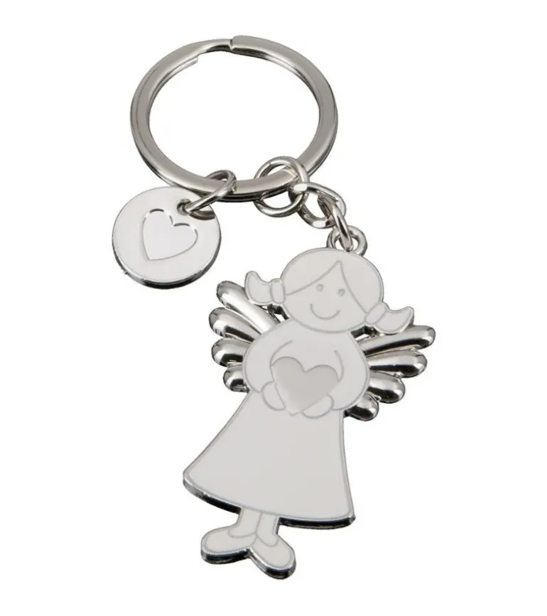 Sød nøglering med en engel, der passer på et hjerte. Englen kan gives til en du holder af, som en reminder om, at Gud altid passer på vedkommende.