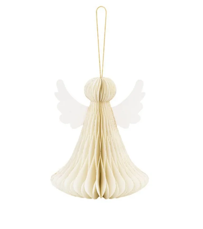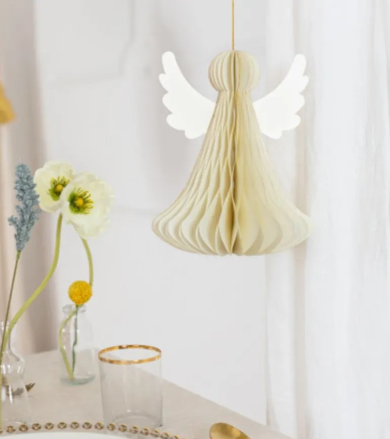 Elegant Papir Engel med honeycomb (pliceret papir) og magnet lukning, der gør det nem at pakke englen sammen efter jul, så den kan bruges igen.