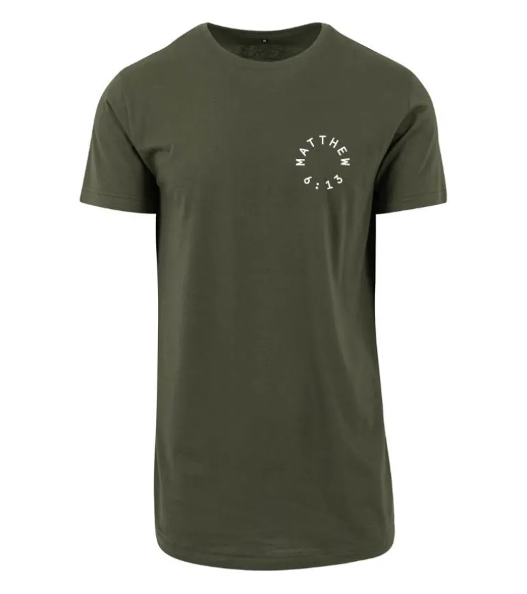 Forsiden har en cirkel på brystet med teksten Matthew 6:13 og på bagsiden er teksten: Kingdom Power Glory Amen