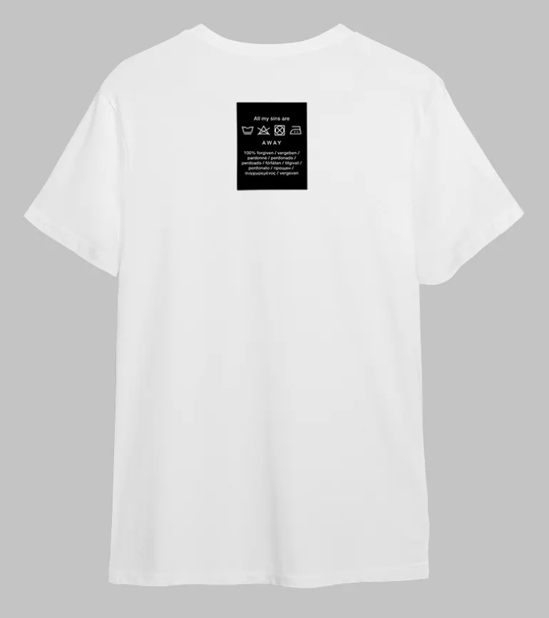 Fed T-shirt med en synlig vaskemærke i nakken. Men det er ikke et helt almindeligt vaskemærke:
