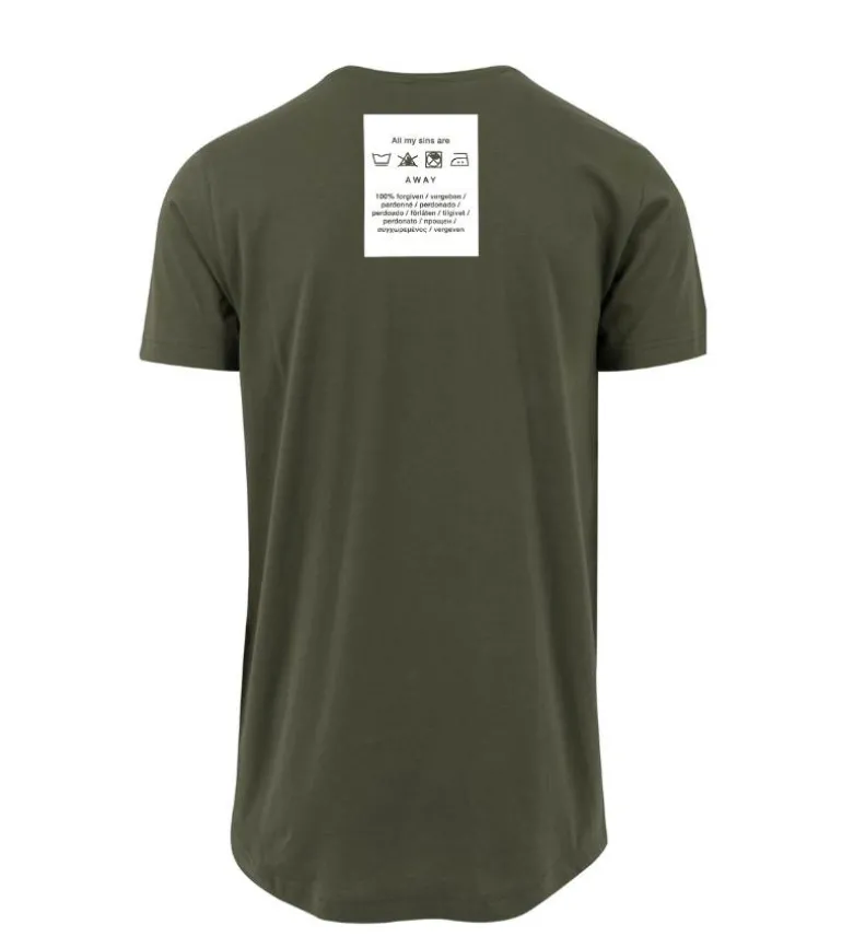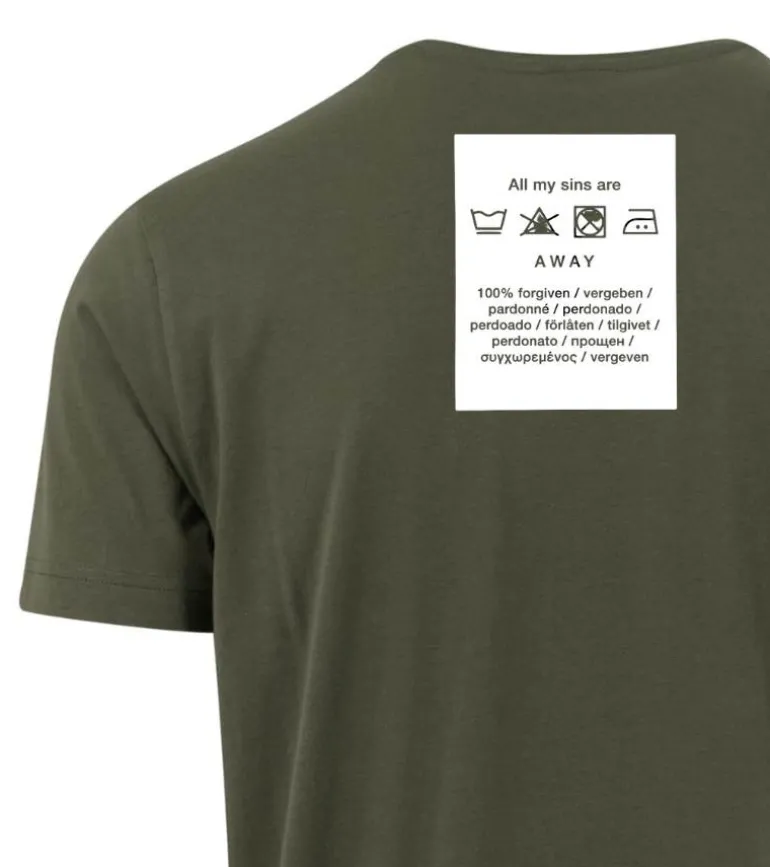 Fed kvalitets T-shirt med en synlig vaskemærke i nakken. Men det er ikke et helt almindeligt vaskemærke: