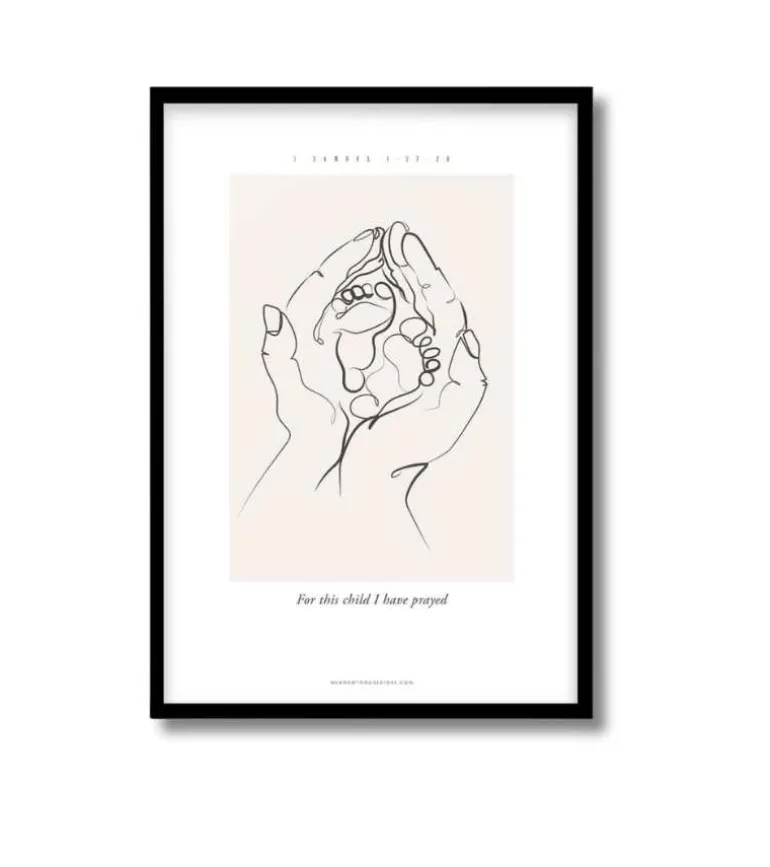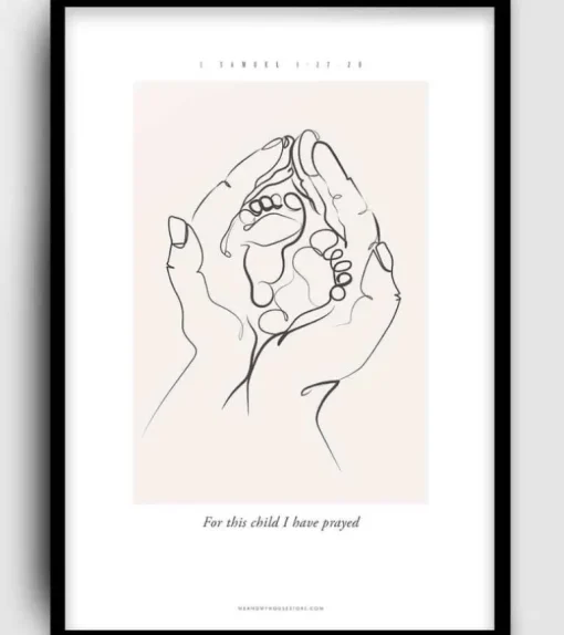 Flot hvid plakat med print af et par baby fødder der bliver ovfavnet.