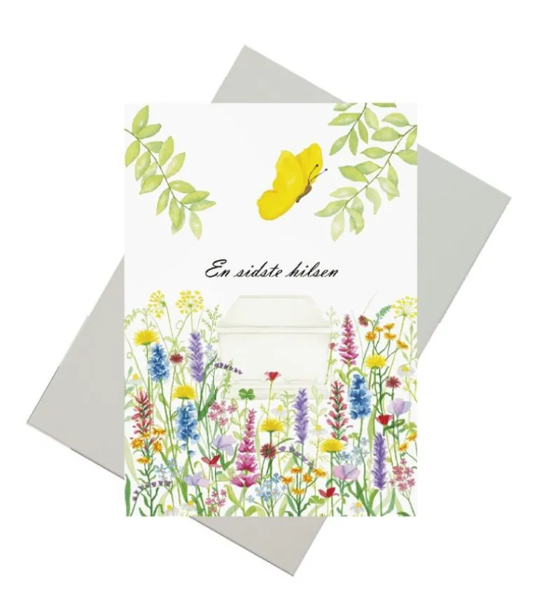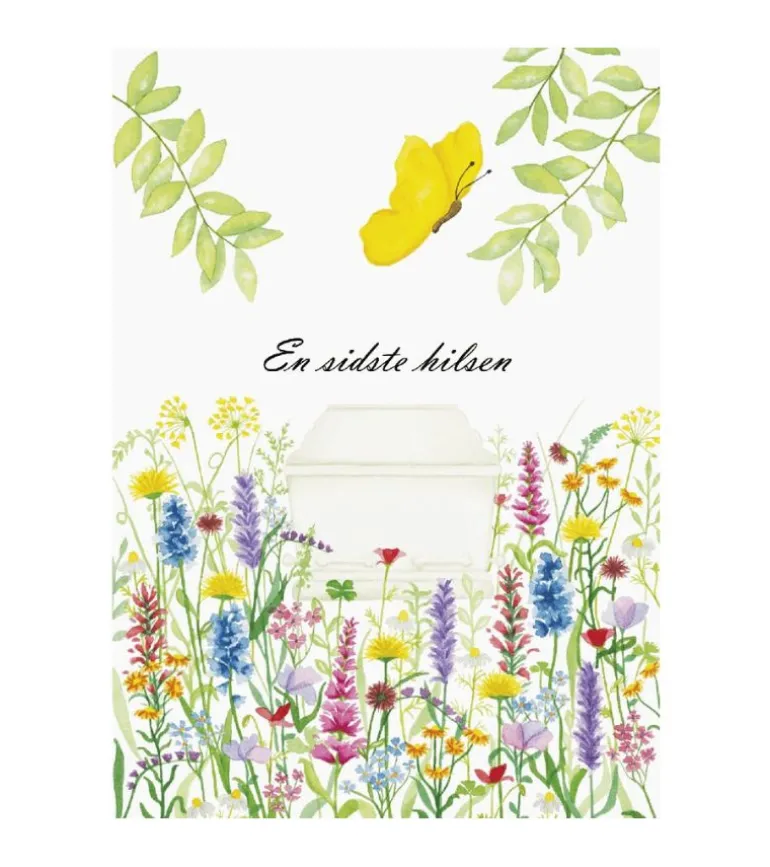 Kondolencekort med ordene “en sidste hilsen” trykt over billedet af en hvid kiste. En gul sommerfugl flyver hen over billedet som et symbol på opstandelsen. Farverige blomster fylder bunden af billedet og minder os om alt det gode der venter os hos Jesus og om det blomsterflor der oftest kommer til begravelser, hvor mange gerne vil give en sidste hilsen i form af en buket, krans mm..