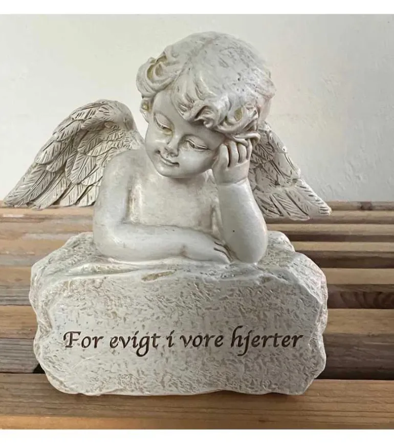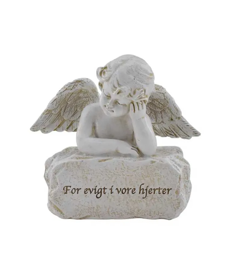 Engel der læner sig over en sten med teksten: For evigt i vore hjerter