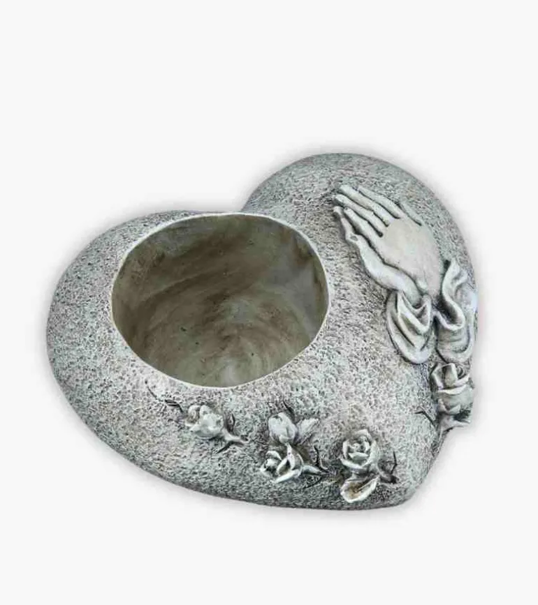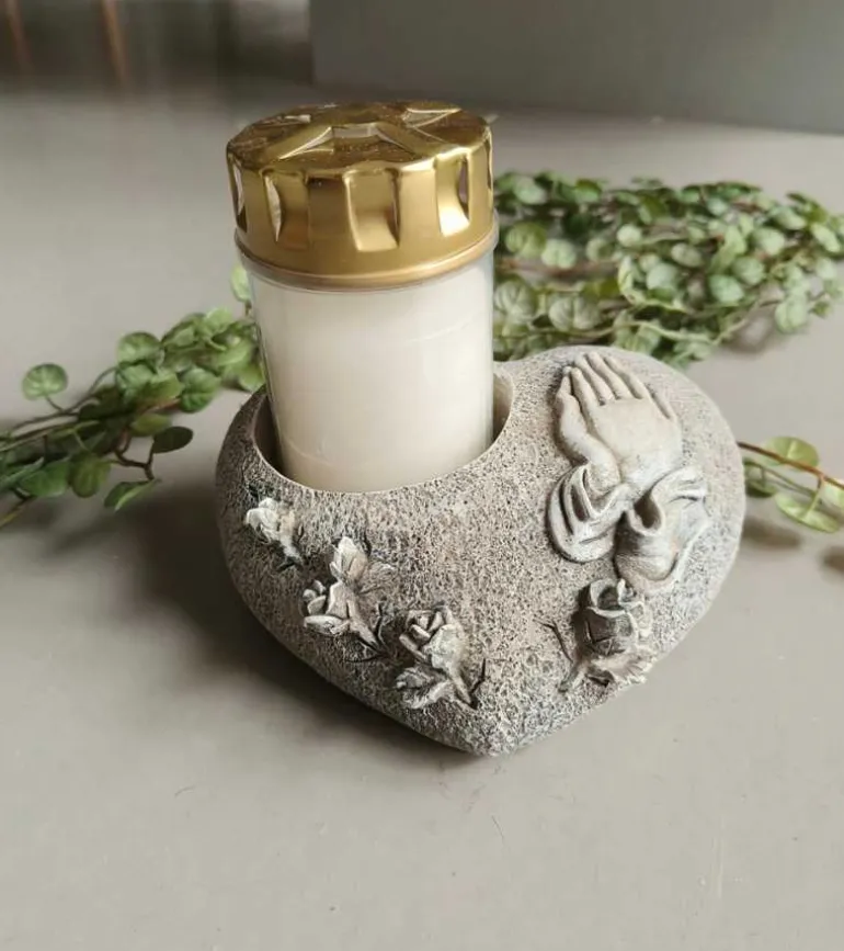 Fin hjertestage til et gravlys. Den er udsmykket med et par hænder i bøn og roser.