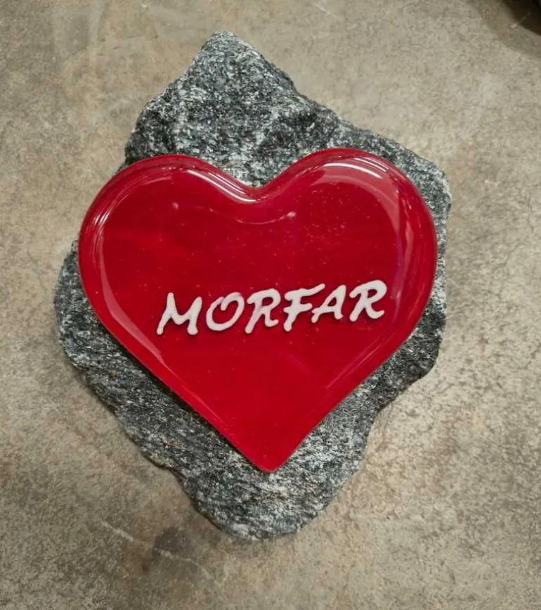 Flot rødt glashjerte med teksten MORFAR, der er monteret på en granitsten.