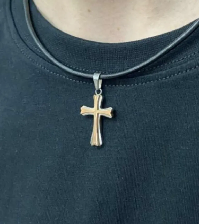 Enkel kors med sølv baggrund og rosa guld korsmarkering.